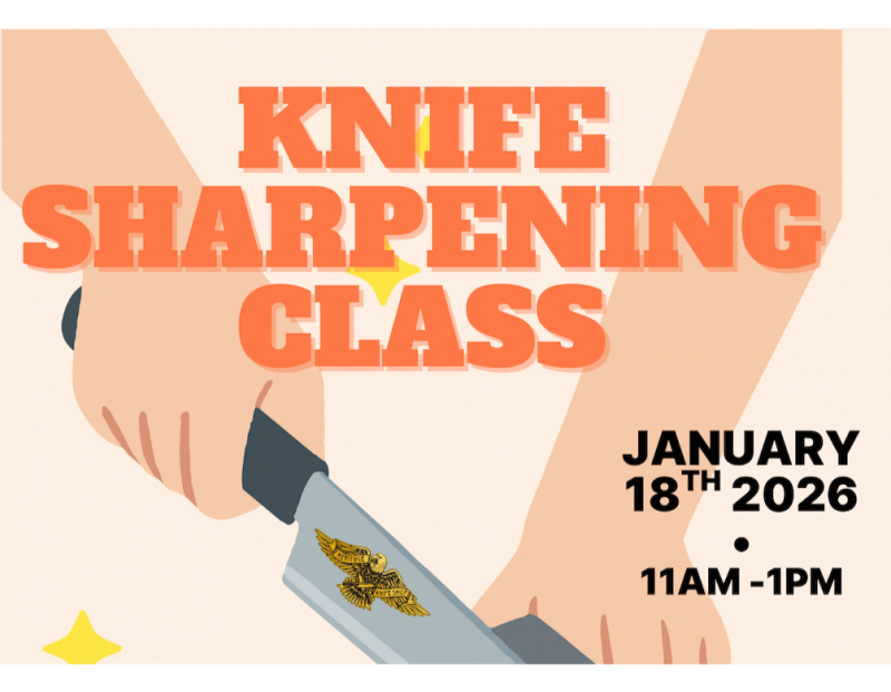 Your registration includes a basic chef’s knife and a double-sided sharpening stone to take home, so you can continue prating your skills long after the class ends.