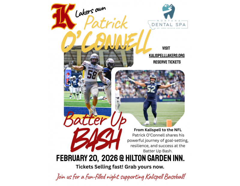 The evening will feature a special guest appearance by Seattle Seahawks linebacker Patrick O’Connell, who will share his journey in athletics and his support for youth and community sports. Proceeds from the Batter Up Bash directly support the Kalispell Lakers Baseball program, helping provide player development opportunities, facility improvements, equipment, and long-term sustainability for the organization.