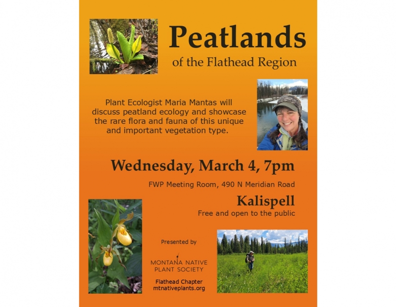 Plant Ecologist Maria Mantas will discuss peatland ecology and showcase the rare flora and fauna of this unique vegetation type. Peatlands are a widespread and common wetland type in the boreal regions of the world. However, they are rare in the temperate climate of Montana. What exactly are peatlands? What makes them unique in comparison to other more common wetlands in our area? How do they form and what native plants and animals call this unique vegetation type home? Learn about the ecology of these rare wetlands in a presentation by plant ecologist Maria Mantas.