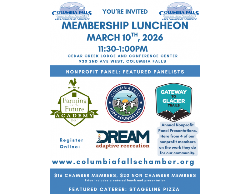 Join the Columbia Falls Area Chamber of Commerce at Cedar Creek Lodge on Tuesday, March 10th, 2026 from 11:30 - 1:00pm for our Chamber membership luncheon. Registration fee includes the featured presentation and a catered lunch.