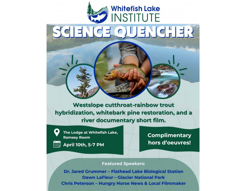 Local voices of science and conservation will speak on northwest Montana’s flora, fauna, and environment at Whitefish Lake Institute’s Science Quencher on April 10th from 5 to 7 pm in the Ramsey Room at The Lodge at Whitefish Lake. This event is free and open to the public.