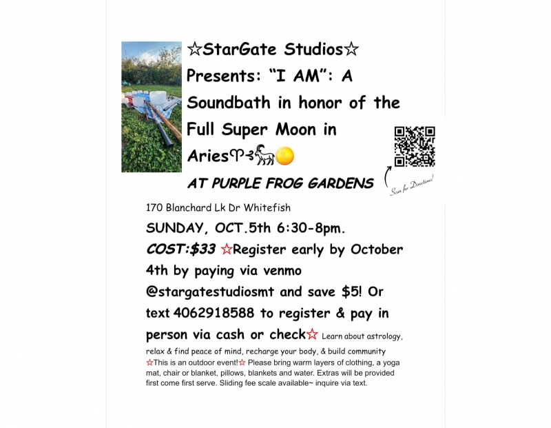 *OUTDOOR EVENT* Soundbath for the Full Super Moon in Aries. Hear a crystal singing bowl performance, outside, at Purple Frog Farm in Whitefish! Register ahead of time to save $5