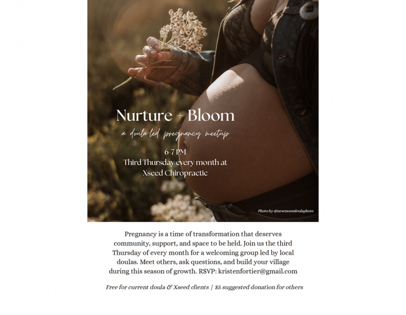 Nurture Bloom, a doula led pregnancy meetup 6-7 PM the third Thursday every month at Xseed Chiropractic. Thank you Maggie for hosting us! Pregnancy is a time of transformation that deserves community, support, and space to be held. Join us the third Thursday of every month for a welcoming group led by local doulas. Meet others, ask questions, and build your village during this season of growth. RSVP: kristenfortier@gmail.com