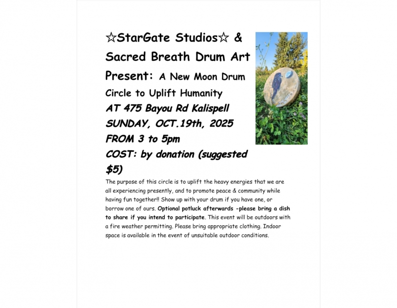 StarGate Studios and Sacred Breath Drum Art Presents: A New Moon Drum Circle to Uplift Humanity. Bring your drum if you have one, or borrow one of ours!