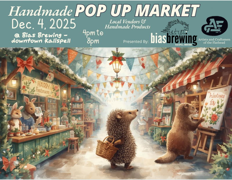 Join us for our Pint Night and Pop Up Market sponsoring Artists and Craftsman of the Flathead Valley. On Thursday, 12/4, from 5-8 pm, $1 per pint sold will go towards this important community organization. Don’t miss this local artist Holiday pop-up Market. It’s chance to shop local this holiday season! We’re bringing together local artists to display/sell their work upstairs in the taproom. Come by for a meal and/or beer and knock out some of your holiday shopping and feel good about supporting local artists! Everything from fine art prints, ornaments, knit hats, baked goods, jewelry represented.