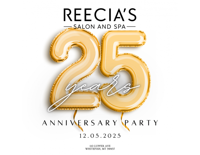 For 25 years, Reecia’s Salon & Spa has been proud to be a part of Whitefish—growing, giving back, and celebrating life with you. So we’re honored to celebrate this milestone with YOU—our friends, neighbors, and family. Join us for an all-day Anniversary Party with local pop-ups, sales, prizes & so much more! Let’s toast to 25 amazing years—together! 🥂